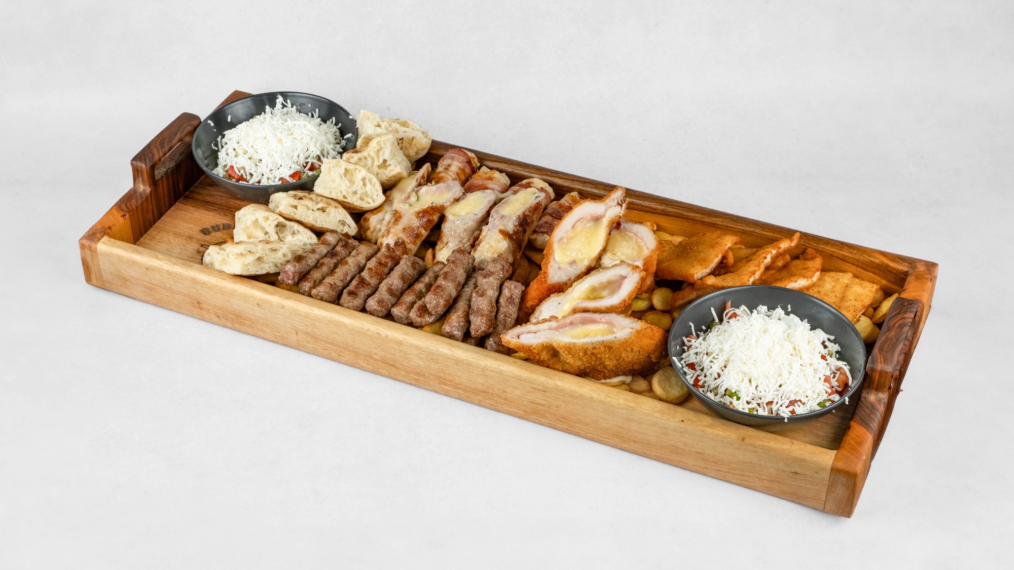 2*ŠIŠ ĆEVAP, 1*GURMANSKA PLJESKAVICA, 2*SVINJSKI RAŽNJIĆI, 1*PUNJENI LUNGIĆ, PEČENA PAPIRKA, 1*DOLLAR KRUMPIR, 1*PEKARSKI KRUMPIR, KAJMAK, AJVAR, 2*LEPINJA -