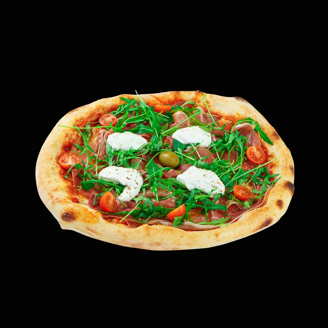 PIZZA PROSCIUTTO (RAJČICA,SIR,PRŠUT,RIKULA,VRHNJE,MINI CHERRY,MASLINA)